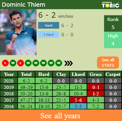 Thiem has a 6-2 win-loss record in 2020, 6-2 on hard (See FULL STATS).