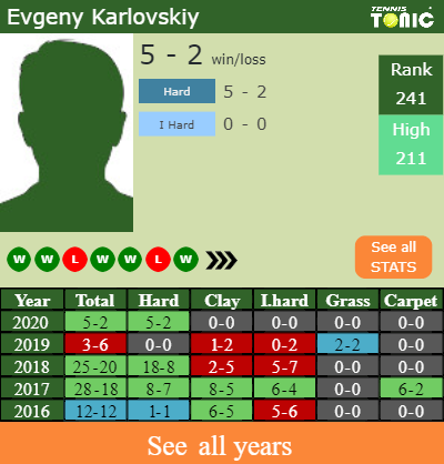 Karlovskiy has a 5-2 win-loss record in 2020, 5-2 on hard (See FULL STATS).