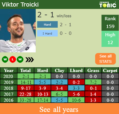 Troicki has a 2-1 win-loss record in 2020, 2-1 on hard (See FULL STATS).