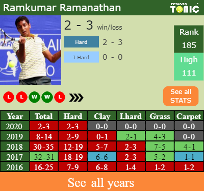 Ramanathan has a 2-3 win-loss record in 2020, 2-3 on hard (See FULL STATS).