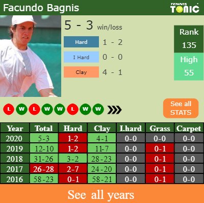 Bagnis has a solid win-loss record in the last 10 years having won 62% of his matches (1413-869). 4-1 on clay in 2020. Regarding his performance on the same surface of this event, Bagnis has a 314-220 win-loss record in the last 10 years on clay.