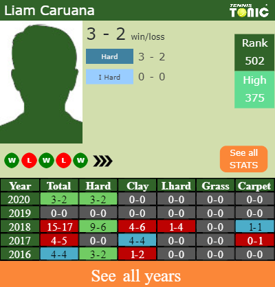 Caruana has a solid record in the last 5 years having won 60% of his matches (45-30). 3-2 on hard in 2020. Regarding his performance on the same surface of this competition, Caruana has a 26-28 record in the last 5 years on hard.
