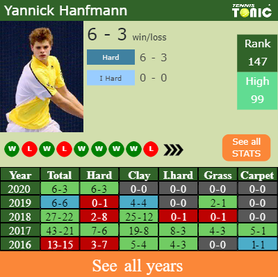The German has a 6-3 win-loss record in 2020, 6-3 on hard (See FULL STATS).