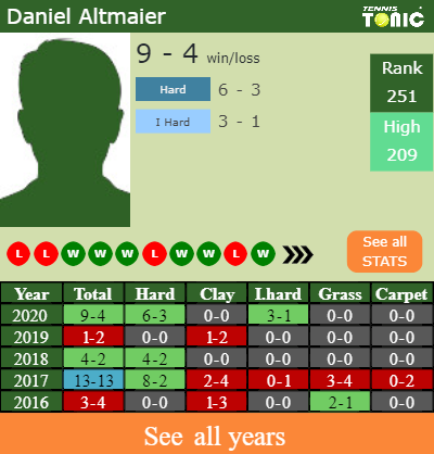 Altmaier has a fantastic win-loss record in the last 6 years having won 71% of his matches (112-46). 6-3 on hard in 2020. Talking about his performance on the same surface of this tournament, Altmaier has a 31-25 win-loss record in the last 6 years on hard.