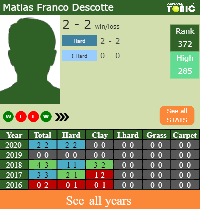 Franco Descotte has a winning record in the last 7 years having won 51% of his matches (27-26). 2-2 on hard in 2020. In connection with his performance on the same surface of this event, Franco Descotte has a 13-13 record in the last 7 years on hard.