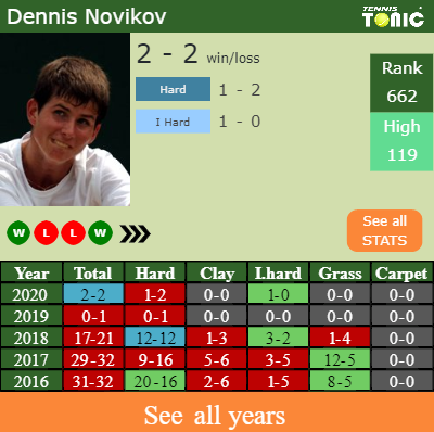 Novikov has a negative record in the last 10 years having won 48% of his matches (125-133). 1-0 on indoor hard courts in 2020. Regarding his performance on the same surface of this competition, Novikov has a 142-150 record in the last 10 years on indoor hard courts.