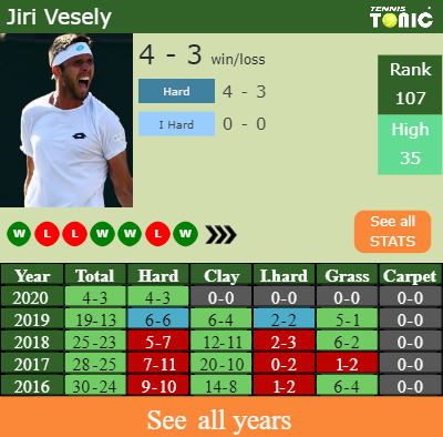 Vesely has won exactly 50% of his matches (357-361) in the last 10 years. 4-3 on hard in 2020. Talking about his performance on the same surface of this tournament, Vesely has a 225-167 record in the last 10 years on hard.