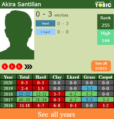 Santillan has a 0-3 win-loss record in 2020, 0-3 on hard (See FULL STATS).