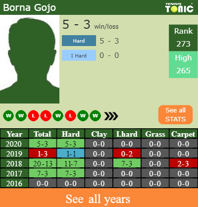 Borna has a 5-3 win-loss record in 2020, 5-3 on hard (See FULL STATS).