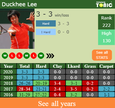 Hee Lee has a unfavourable record in the last 8 years having won 49% of his matches (425-405). 3-3 on hard in 2020. Regarding his performance on the same surface of this competition, Hee Lee has a 119-126 record in the last 8 years on hard.