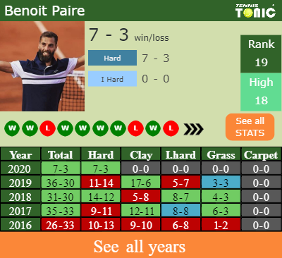 The French Player has a 7-3 win-loss record in 2020, 7-3 on hard (See FULL STATS).