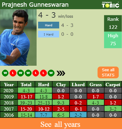 Prajnesh has a 4-3 win-loss record in 2020, 4-3 on hard (See FULL STATS).
