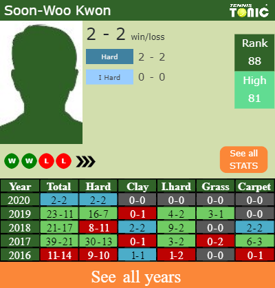 The Korean has a 2-2 win-loss record in 2020, 2-2 on hard (See FULL STATS).
