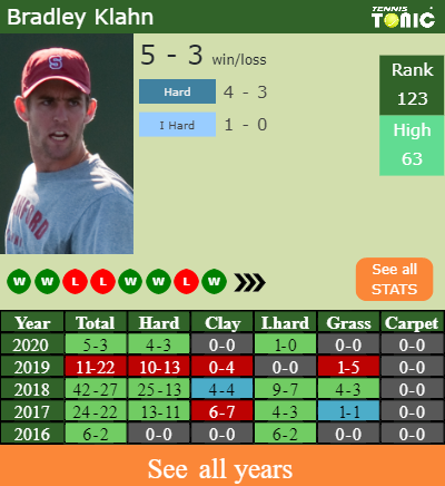 Klahn has a solid win-loss record in the last 10 years having won 60% of his matches (154-102). 1-0 on indoor hard courts in 2020. Regarding his performance on the same surface of this competition, Klahn has a 188-142 record in the last 10 years on indoor hard courts.