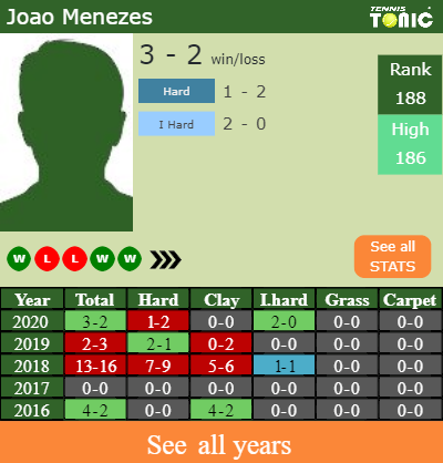 Lucas Magalhaes Hueb De Menezes has a 3-2 win-loss record in 2020, 2-0 on indoor hard courts (See FULL STATS).