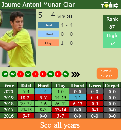 Jaume has a 5-4 win-loss record in 2020, 1-0 on clay (See FULL STATS).