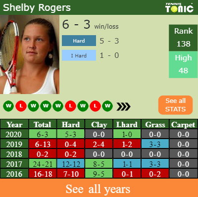 Rogers has a winning record in the last 9 years having won 55% of her matches (40-48). 1-0 on indoor hard courts in 2020. In connection with her performance on the same surface of this tournament, Rogers has a 91-109 win-loss record in the last 9 years on indoor hard courts.