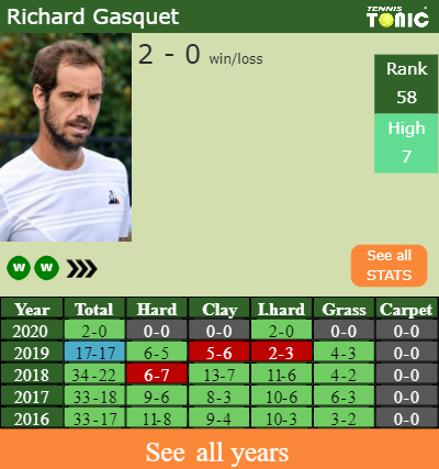 Gasquet has a solid record in the last 10 years having won 67% of his matches (404-203). 2-0 on indoor hard courts in 2020. In connection with his performance on the same surface of this event, Gasquet has a 314-172 record in the last 10 years on indoor hard courts.