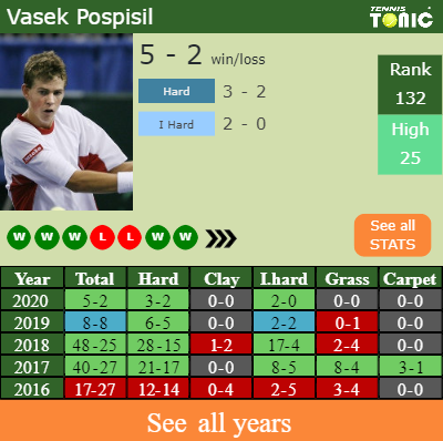 Pospisil has a solid record in the last 10 years having won 64% of his matches (356-197). 2-0 on indoor hard courts in 2020. Talking about his performance on the same surface of this tournament, Pospisil has a 276-213 win-loss record in the last 10 years on indoor hard courts.