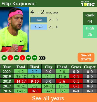 Krajinovic has a solid record in the last 10 years having won 63% of his matches (389-224). 2-0 on indoor hard courts in 2020. Talking about his performance on the same surface of this event, Krajinovic has a 271-150 record in the last 10 years on indoor hard courts.