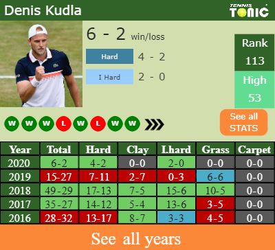 Kudla has a 6-2 win-loss record in 2020, 2-0 on indoor hard courts (See FULL STATS).