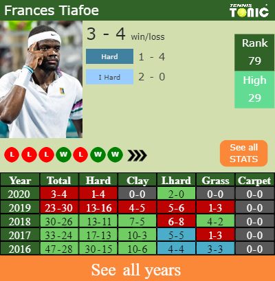 Tiafoe has a 3-4 win-loss record in 2020, 2-0 on indoor hard courts (See FULL STATS).