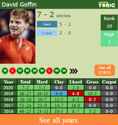 Goffin has a 7-2 win-loss record in 2020, 2-0 on indoor hard courts (See FULL STATS).