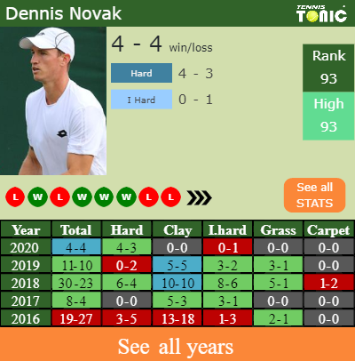 Novak has a 4-4 win-loss record in 2020, 0-1 on indoor hard courts (See FULL STATS).