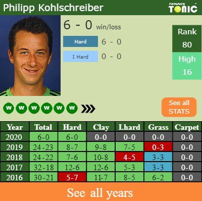 Kohlschreiber has a 6-0 win-loss record in 2020, 0-0 on indoor hard courts (See FULL STATS).