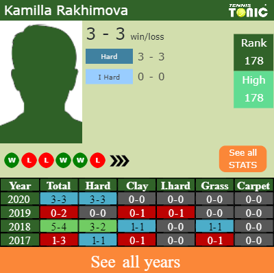 Rakhimova has a 3-3 win-loss record in 2020, 0-0 on indoor hard courts (See FULL STATS).