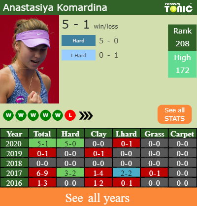 Komardina has a 5-1 win-loss record in 2020, 0-1 on indoor hard courts (See FULL STATS).