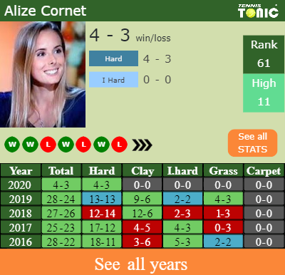 Alize has a 4-3 win-loss record in 2020, 0-0 on indoor hard courts (See FULL STATS).