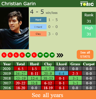 Garin has a solid record in the last 9 years having won 62% of his matches (822-494). 3-0 on clay in 2020. Talking about his performance on the same surface of this event, Garin has a 220-151 win-loss record in the last 9 years on clay.