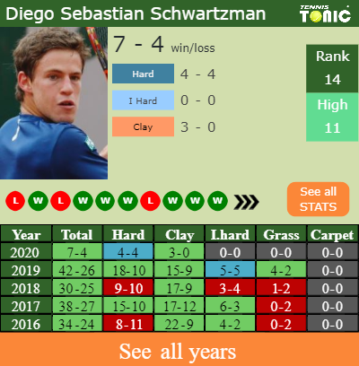 The Argentine has a 7-4 win-loss record in 2020, 3-0 on clay (See FULL STATS).