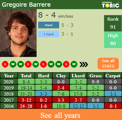 Barrere has a negative record in the last 9 years having won 43% of his matches (305-233). 3-1 on indoor hard courts in 2020. Talking about his performance on the same surface of this competition, Barrere has a 99-98 win-loss record in the last 9 years on indoor hard courts.