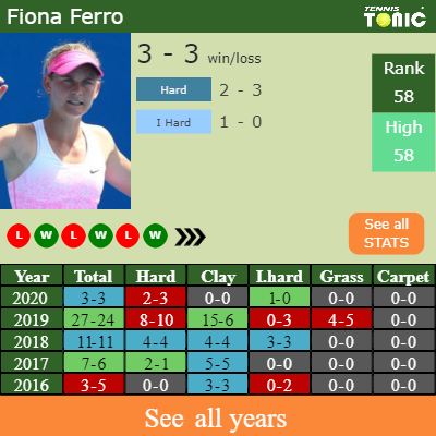 Ferro has a solid record in the last 8 years having won 64% of her matches (26-47). 1-0 on indoor hard courts in 2020. Regarding her performance on the same surface of this tournament, Ferro has a 60-63 record in the last 8 years on indoor hard courts.