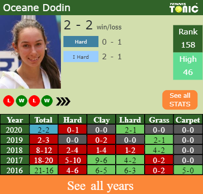 Dodin has a winning record in the last 9 years having won 55% of her matches (91-73). 2-1 on indoor hard courts in 2020. In connection with her performance on the same surface of this tournament, Dodin has a 58-71 record in the last 9 years on indoor hard courts.