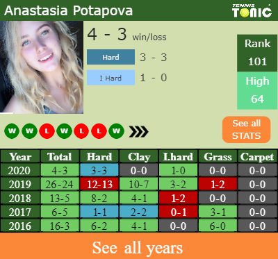 Potapova has a 4-3 win-loss record in 2020, 1-0 on indoor hard courts (See FULL STATS).