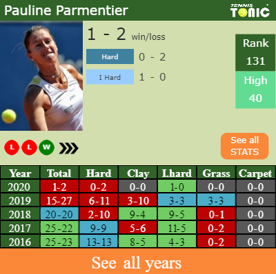 Parmentier has a solid win-loss record in the last 10 years having won 61% of her matches (229-147). 1-0 on indoor hard courts in 2020. Regarding her performance on the same surface of this competition, Parmentier has a 132-171 record in the last 10 years on indoor hard courts.