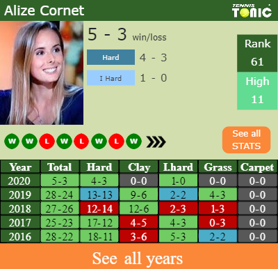 Alize has a 5-3 win-loss record in 2020, 1-0 on indoor hard courts (See FULL STATS).