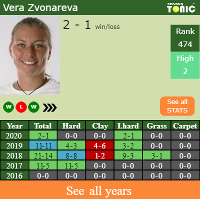 Vera has a 2-1 win-loss record in 2020, 2-1 on indoor hard courts (See FULL STATS).