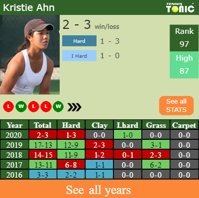 Ahn has a losing win-loss record in the last 9 years having won 44% of her matches (10-8). 1-0 on indoor hard courts in 2020. Regarding her performance on the same surface of this event, Ahn has a 51-50 win-loss record in the last 9 years on indoor hard courts.