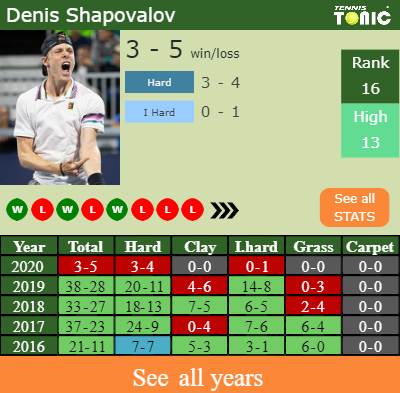 The Canadian has a 3-5 win-loss record in 2020, 0-1 on indoor hard courts (See FULL STATS).