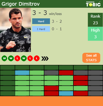 Dimitrov has a 3-3 win-loss record in 2020, 0-1 on indoor hard courts (See FULL STATS).
