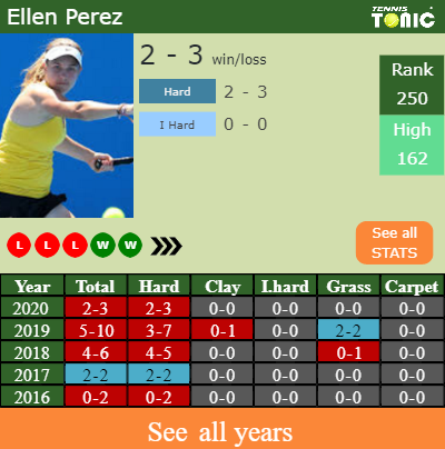 Ellen has a 2-3 win-loss record in 2020, 2-3 on hard (See FULL STATS).