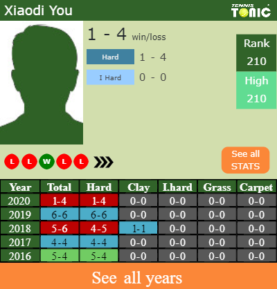 You has a 1-4 win-loss record in 2020, 1-4 on hard (See FULL STATS).