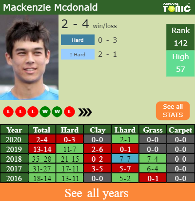 Mackenzie has a 2-4 win-loss record in 2020, 2-1 on indoor hard courts (See FULL STATS).