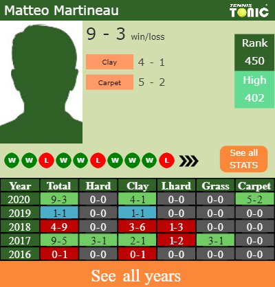 Matteo has a 9-3 win-loss record in 2020, 0-0 on indoor hard courts (See FULL STATS).