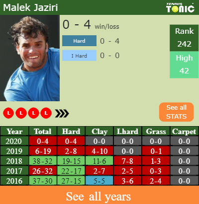 Jaziri has a 0-4 win-loss record in 2020, 0-4 on hard (See FULL STATS).