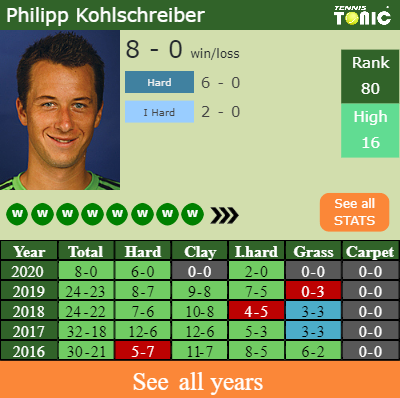 Kohlschreiber has a winning record in the last 10 years having won 56% of his matches (283-218). 2-0 on indoor hard courts in 2020. Regarding his performance on the same surface of this competition, Kohlschreiber has a 290-203 record in the last 10 years on indoor hard courts.